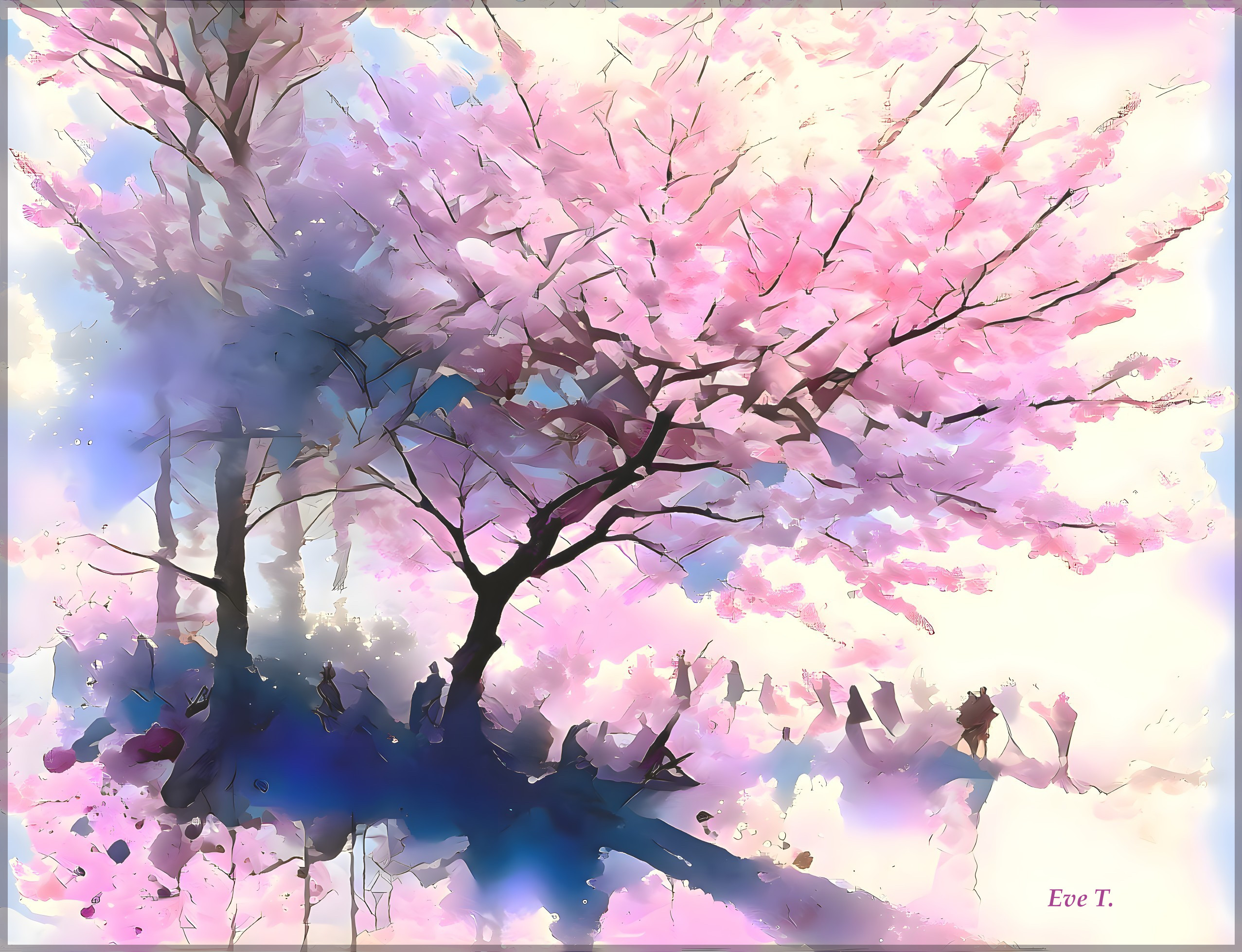 Prompt: Acrylic and chalk highly detailed digital painting of a serene and artistic scene of a woman with burgundy hair styled in a loose bun, standing with her back to the viewer. Her back and arms are adorned with intricate tattoos of cherry blossoms and two elegant swans in flight as seen by her low back shirt. She is surrounded by a tranquil landscape featuring a peaceful lake, swans swimming gracefully, and delicate pink cherry blossom trees in full bloom. In the distance, a traditional East Asian-style pavilion and arched bridge add a touch of cultural elegance. The lighting is soft and dreamy, enhancing the romantic and tranquil atmosphere, with a perfect blend of natural beauty and body art.