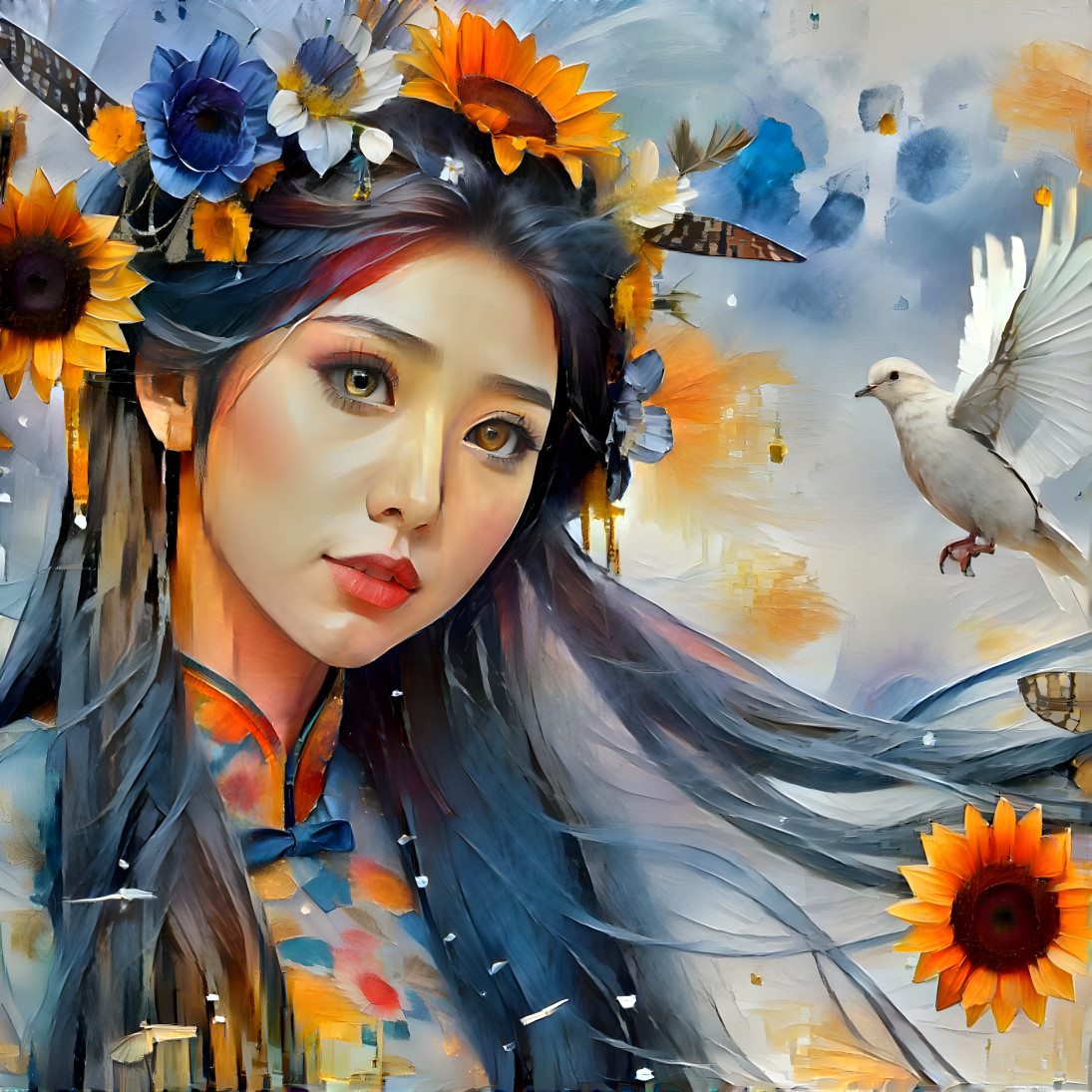 Prompt: Vibrant floral garden setting, mature woman in her prime, detailed floral and shrub arrangements, influenced by Rossetti and Waterhouse, ultra-realistic style, full-body depiction, Millais-inspired essence, woman warrior theme integration, lush green environment, cheerful Asian woman focal point, impasto technique for textured depth, bold palette knife strokes on coarse linen canvas, dreamlike quality on deepdreamgenerator.com, fantasy ambiance, rose tones, Unreal Engine generation, colorful palette, beautiful and detailed, cheerful eyes, Victorian attire, emphasis on Asian beauty, bold and resolute painting style.