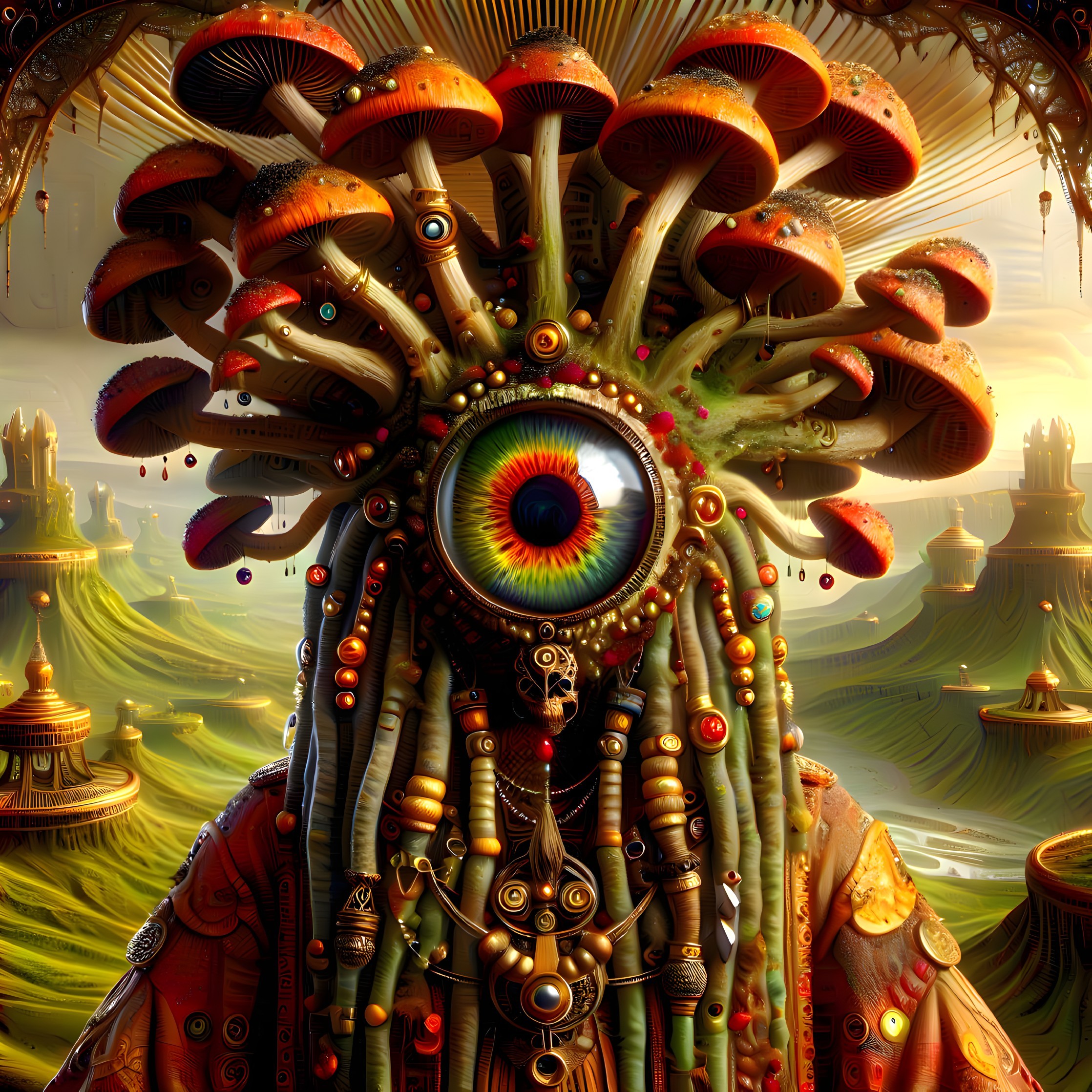 Prompt: Time-traveling alien alchemist amidst mystical elements, sacred geometry, intricate mandalas, and the all-seeing eye. Neon mandala glowing, Galactic DMT pyramid radiating cosmic energy, moonlight illuminating a dense jungle, UFO silently traversing the surreal scene. Mystical artifacts with magic energy. Towering 3D-rendered psilocybin mushrooms, rocky peaks adorned with detailed relief carvings in the distant background. Alien flora weaving together to form a mesmerizing tapestry. Psychedelic features like galactic DMT entities, hallucinogenic vibes, and LSD art aesthetic. Fantasy landscape with vibrant hues, intricate patterns, and otherworldly lighting effects. Infuse a sense of mystery and wonder. Artists: Moebius, James McCarthy.