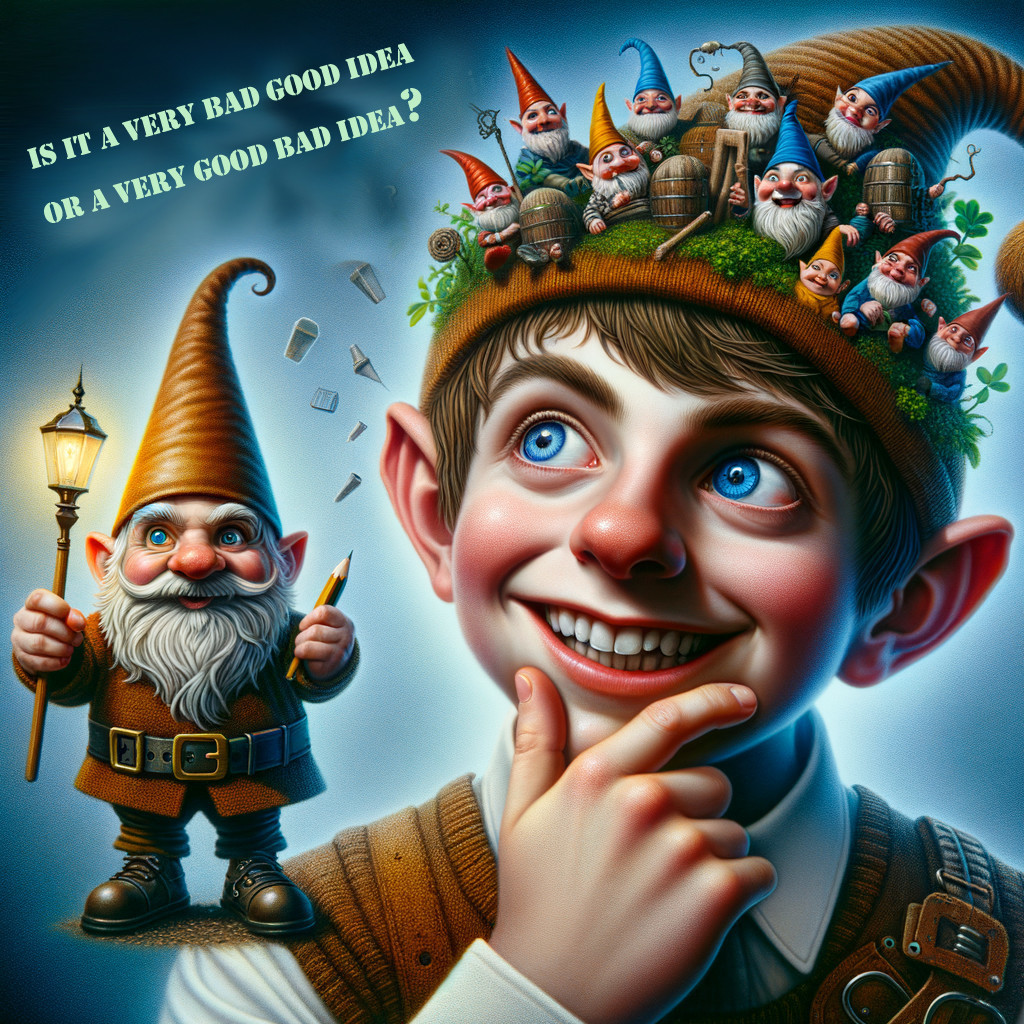 Prompt: In Everlynne Lockewood style,Create a humorous portrait of a gnome standing in a whimsical forest clearing, surrounded by tall, swaying mushrooms and glowing fireflies. This middle-aged gnome has a hilariously oversized pointed hat, which towers above him and almost touches his right shoulder. His light blonde beard is a textured, voluminous mass of soft waves, and he sports a cheeky grin, as if he's about to burst into a fit of laughter. One eyebrow is raised with mischievous intent, and his eyes gleam with a playful twinkle. Holding one finger to his lips in an exaggerated "shh" gesture, he seems to be guarding a very silly secret. The gnome wears a dark blue collared shirt, which stands out against the vibrant, lively background of his forest surroundings, making him the undeniable focal point of the scene. His expression combines charm with a hint of absurdity, creating an image of both humor and mystery.