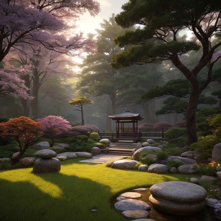 The background is a lush garden filled with green foliage, softly blurred to enhance the subject's prominence. Filtered sunlight streams through the leaves, creating a warm, inviting atmosphere with a bokeh effect. The ambiance evokes a sense of happiness and tranquility, perfect for a serene outdoor portrait.
