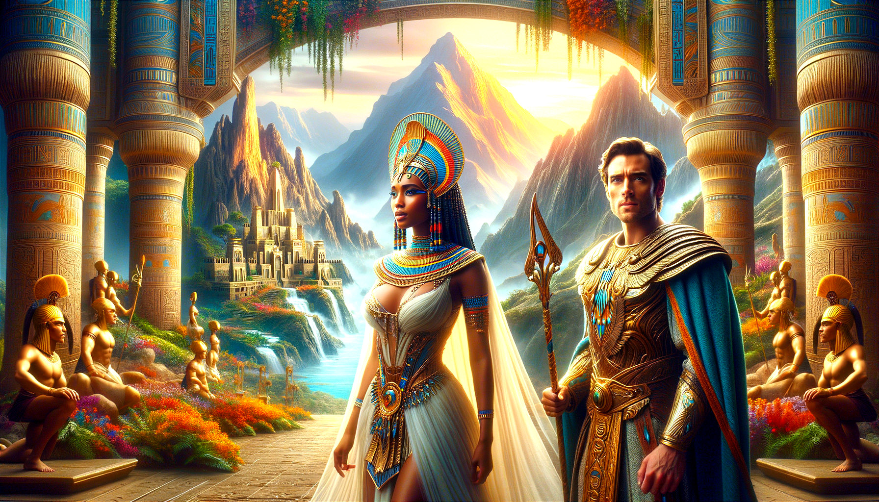 • Prompt: "Cleopatra and Julius Caesar" in a lush Egyptian landscape - ultra high quality, focused, sharp focus, extremely detailed, high definition, intricate, fantasy, colorful, fantastic view