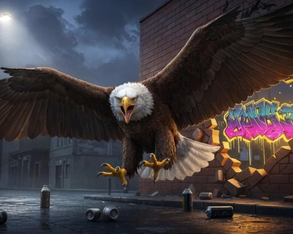 Prompt: An abstracted, colorful, yet Art Deco influenced portrait constructed out of octagonal voxels of abald eagle, facing forward with it's wings open. The multi-layered fractal feathers are interwoven with mystical symbols, and sacred geometry in three-dimensional layers over a background of a 3d fractal jungle.
