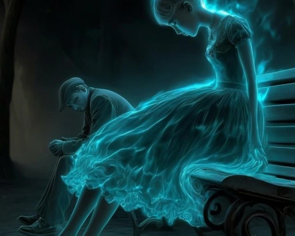 Prompt: Two women dance together their dresses forming a mesmerizing flame that dances in perfect symmetry, splitting into twin tendrils with the woman's golden hair conjoins against a pure black canvas. The woman's satin dresses emulate fire that transitions from deep sapphire blue at its base through rich amber to bright yellow tips at the bodice, creating a striking color gradient. Delicate, feather-like edges of the dresses reveal microscopic details where fire meets air, while swirling silver satin ribbons resemble smoke particles create ethereal patterns above. The dramatic backlighting illuminates the flame like dresses with translucent qualities, revealing the intricate architecture of combustion. This intimate portrait of fire captures the perfect moment of duality—where a single flame becomes two—symbolizing the elemental forces of warmth, energy, and transformation in stunning macro detail.