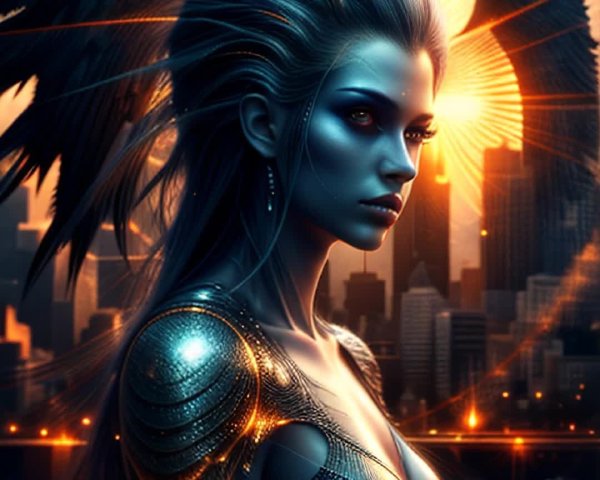 Prompt: technoangel, protecting a female companion, deep saddness, emotional facial features, futuristic dark city, lots of lighting, 3d, magic, fire. warriors with mechanical wings