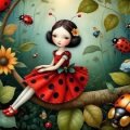Prompt: Small butterflies and woman standing holding bouquets of pink small poppies with her children portrait in the style of Scott Bergey, Squeak Carnwath and Peter Wileman