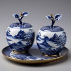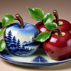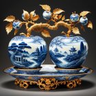 Prompt: Still life, fantasy flowers in intricate glass spheres, blue background with clouds,