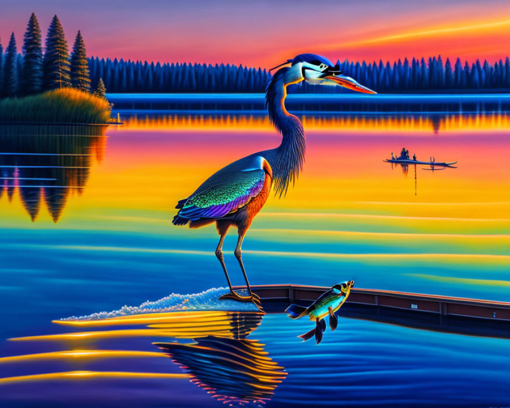 Prompt: A blue heron drinking from the Willamette a rainbow trout being reeled in jumping on the fisherman's line as the the sternwheeler passes in the distance at dusk with the golden man gleaming in the background