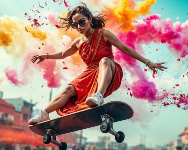 At the heart of the canvas stands a luminous female figure with sun-kissed blonde hair, head slightly tilted, lips curled into an elusive smile. It’s a smile meant not merely for the viewer, but for the system watching through them. Her eyes meet the “lens” with calm certainty — not seeking attention, but acknowledging presence.