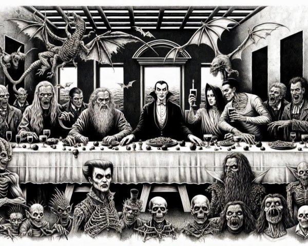 Prompt: Create an image of a ghost with a head that looks like a vintage porcelain doll face with distinct features. The doll has a round face with a smooth, white complexion and delicate rosy cheeks. Its eyes are painted, and it has a small, evil smile. The hair is styled in glossy black curls and is part of the sculpted head. The ghost's body appears as a frilly but shabby dress made of beige fabric adorned with small red floral patterns.