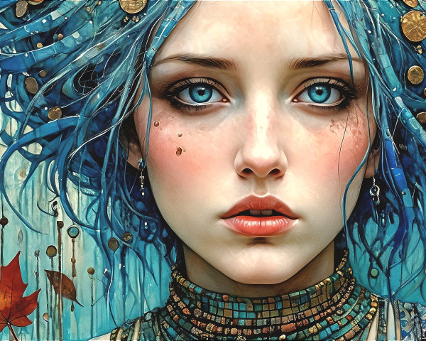 Prompt: Mixed media painting "Hetairas in the autumn ". Acrylic, ink and sunken relief. Original oil painting by Margaret Macdonald Mackintosh. Style Edouard Vuillard. silver and full-colour illustration. Drifting, gouache with beads, sequins, and gold. in icy cool blues, aquas, warm siennas and ochres, Zentangle, Mosaik, patchwork