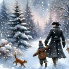Im dichtenn Schneegestöber eines kalten Wintertages geht in der Ferne ein junger Mann mit einem kleinen Jungen an der rechten Hand, durch einen verschneiten Tannenwald. Der Mann trägt einen dunklen Wollmantel dessen Kragen hochgestellt ist und einen dunklen Hut mit einer schmalen Krempe. Der Junge trägt eine warme, wollene Jacke, Handschuhe aus Wolle und eine Mütze mit Bommel auf dem Kopf.