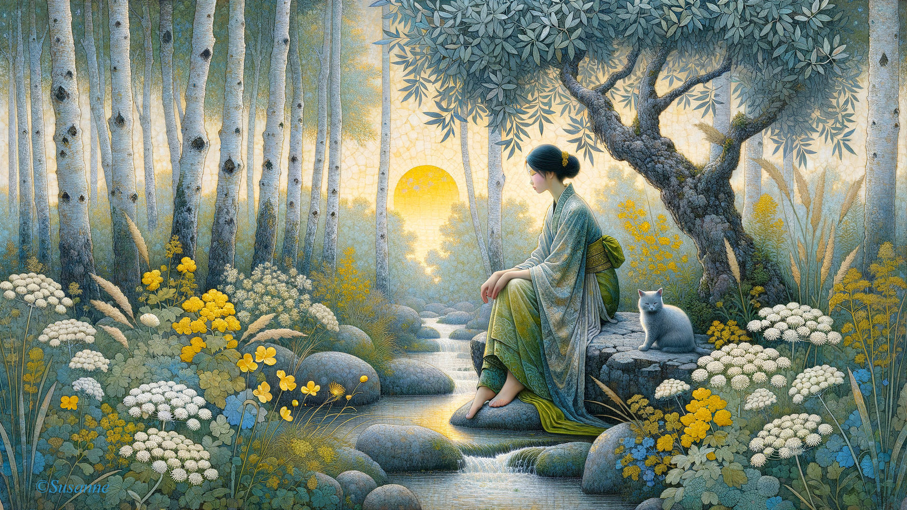 • Prompt: Olive trees by the stream, the sun peeking through the canopy of leaves. A woman dressed in gray-green and yellow colors sits on a jagged stone and looks pensively into the water. Small yellow wildflowers, queen anne's lace, tall grasses. A bluish-gray cat sits next to it. textured look in the style of Nicole Gustafsson with an abstract mix of blue and green tones, overlaid with touches of gold leaf and pale, intricate floral or lace patterns, with delicate hints of birch trees in the background giving it an ethereal feel. The overall atmosphere of the piece should be gentle and picturesque, with a patchwork of bright and soft colors highlighting the serenity of the subject.