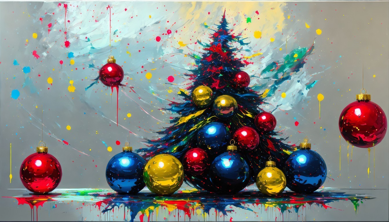 Prompt: Oversized metallic Christmas balls in random sizes and placement. Jimmy Law style painting. A palette of red, blue, yellow, and green. Energetic paint splatters. Futuristic. Psychedelic. Matte background. Cyberpunk. Impasto painting.