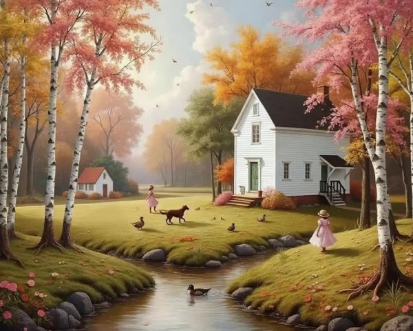 Prompt: Create an oil of canvas of a whimsical scene featuring two friendly, cartoonish ghosts with cheerful expressions. The ghosts should be depicted in a playful manner, with one ghost wearing a small orange hat and both having large, expressive eyes. In the background, there are clothes hanging on a clothesline. The clothing consists of a mixture of light-colored shirts, a bright orange shirt, and a patterned dress, all fluttering lightly as if in a gentle breeze.