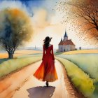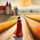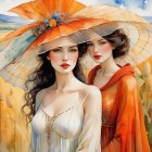 Prompt: A stunning watercolor portrait of an elegant woman with beautifully styled, intricate red or copper-colored hair, reminiscent of classical art. She has delicate features, captivating eyes, and subtle blush on her cheeks and lips. She wears a high-collared dress in a blend of deep indigo, teal, and muted green watercolor washes. Behind her, a radiant, glowing golden-orange halo or circular aura dominates the background, blending outward into soft, abstract washes of ochre, pale blue, and warm peach. The entire piece should exhibit the fluid, translucent quality of watercolor, with visible brushstrokes and natural blending, creating a harmonious contrast between warm background tones and cool foreground attire. The style is sophisticated, serene, and painterly, with a dreamlike, ethereal quality.