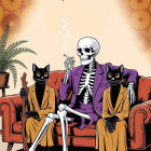 Prompt: Illustration, a smoking skeleton lounging on a retro orange couch, two black cats in matching orange robes flanking him, one holding a staff, the scene set in a room with 1970s-style floral wallpaper, soft, diffused lighting creating a warm, nostalgic atmosphere, color palette dominated by warm earth tones, ochre, orange, and umber, stylized linework and flat color planes, reminiscent of mid-century modern illustration, low angle perspective, intimate and slightly surreal, high detail.