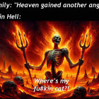Prompt: A skeletal figure in a defiant stance, holding two flaming trident-tipped torches, stands in the fiery landscape of Hell. Demons lurk in the background. The figure's bone structure is only visible, with no clothing. The style is a fusion of classical fantasy illustration, experimental photography, ugly art concept, 1965 Topps, brutal yet comical, creepy Cronenberg-inspired, pole dancing doll-beetle hybrid, abstract surrealism, with elements of Anton Semenov, Mark Rothko, Harry Bliss, and Joan Miró. Features include thick impasto, cracked textures, blood ink, highly detailed, 8k resolution, schizophrenic aesthetics, edgy visuals, trending on Artstation, and Fluxcore style favoring dramatic lighting. The color palette is dominated by reds and oranges, with yellow flame highlights. Low-key lighting with strong contrasts accentuates the infernal environment, adding texture and depth to lava and demon forms. The mood is dark humor, despair, and fierce protectiveness, creating chaotic angst.