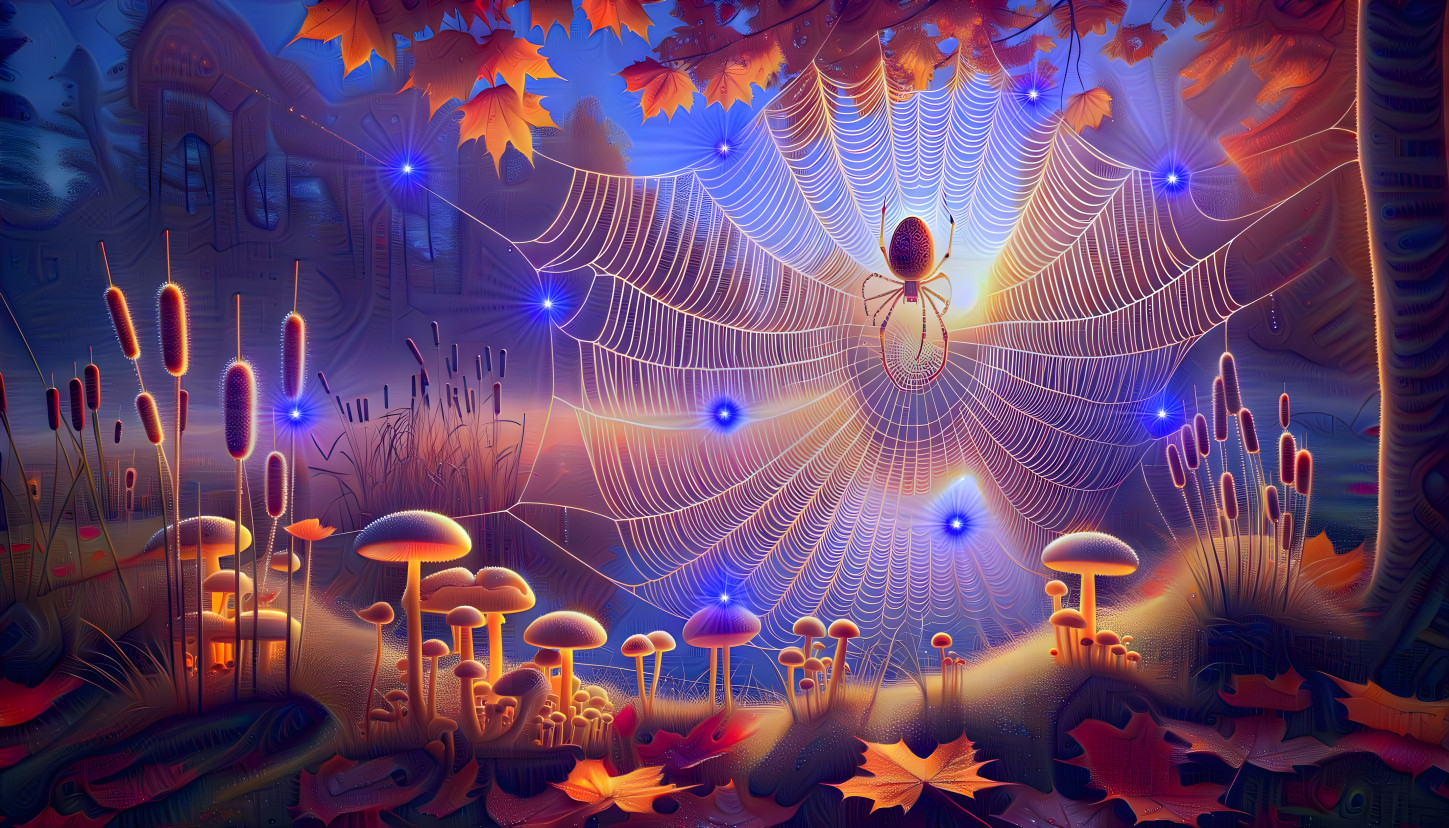 Prompt: a serene autumn morning - a unique golden spider with long legs, spinning its golden web between maple tree branches. the morning sun reflects brightly on each golden thread. the morning dew droplets hanging on each thread magnify the sun rays with bokeh. thin layer of mist upon the surface of the pond. patches of tall grass and cattail at the edge of the pond. vibrant autumn color leaves on the ground. gradient blue sky.