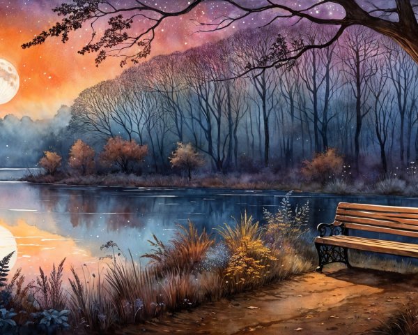 Twilight Serenity at a Lake Side Bench Beside Calm Waters
