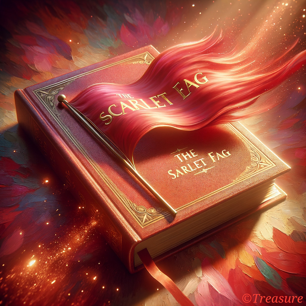 Prompt: A book with a scarlet-colored cover fluttering open. The words "The Scarlet Flag" in golden cursive lettering on the cover. All around, radiance and sparkles.