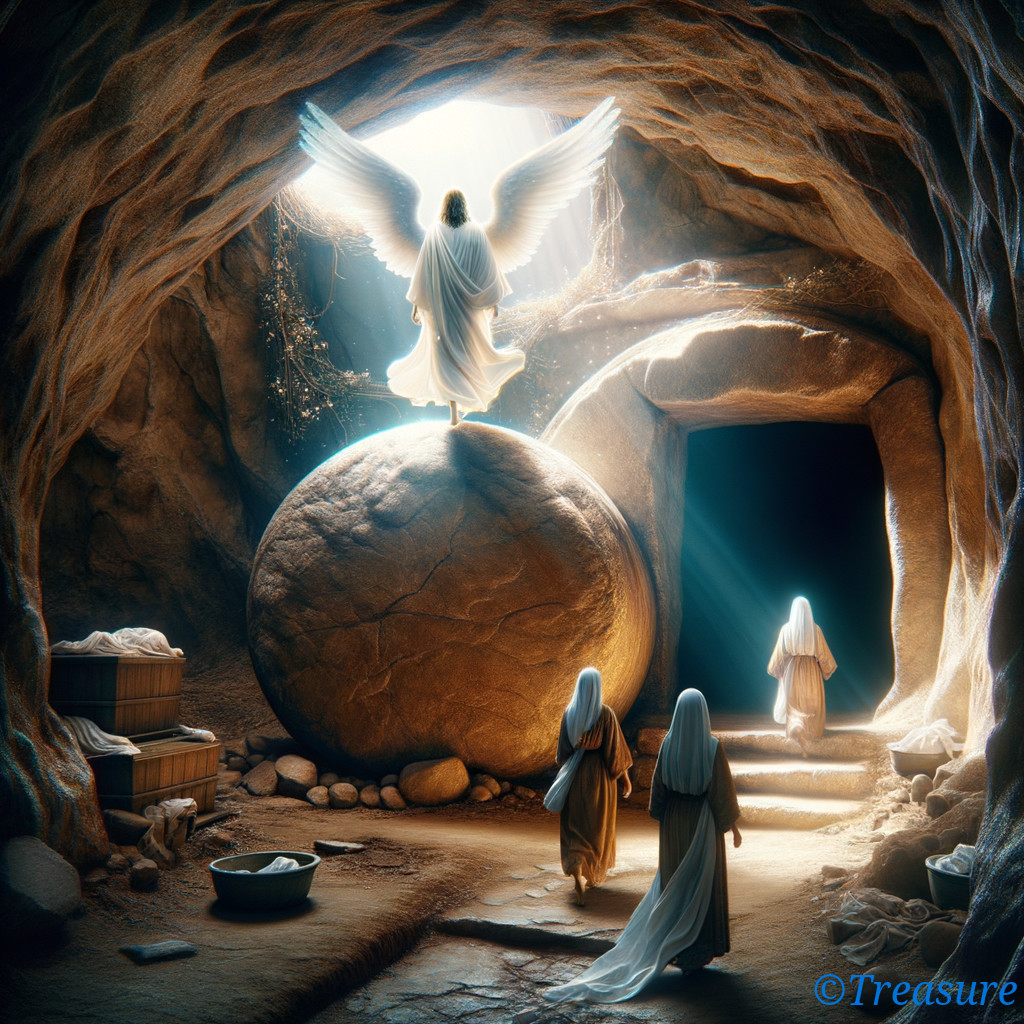 Prompt: A small round-mouthed, stone cave tomb with a huge circular boulder shaped to fit the opening of the tomb on one side with a magnifiscent, majestic, giant luminescent male angel in glowing white robes sitting on top of the boulder, as three biblically dressed women come down the dirt path leading to the tomb carrying basins and cloths. The image give a powerful feeling of beauty and holds the essence of the great ressurection of Jesus.