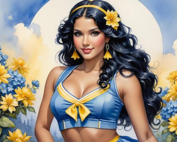 Prompt: A whimsical illustration of a young woman walking through a vibrant, flower-filled landscape at night. She has a warm skin tone and a cheerful expression, with brown, wavy hair that falls just below her shoulders. Her outfit consists of a bright yellow long-sleeve top and stylish white checkered pants. She carries a small purple handbag and wears classic white sneakers. Surrounding her are large, colorful flowers in various shades including pink, purple, and orange, alongside lush green leaves. The background features a deep blue night sky sprinkled with stars and a crescent moon, creating a serene atmosphere. The overall mood of the illustration is joyful and enchanting, highlighting the beauty of nature and the charm of a peaceful evening stroll.