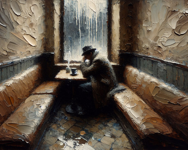 Prompt: A solitary figure hunched over a small wooden table in a shadowy, old-world coffeehouse, their features obscured by dim light and thick, swirling brushstrokes of impasto acrylic. Raindrops streak diagonally across a fogged windowpane beside them, diffusing the weak gray daylight into hazy pools that illuminate drifting steam from a half-full ceramic cup. Textured layers of paint build the worn leather booth, the cracked tile floor, and the figure’s slumped posture, with visible knife marks and heavy dabs in ochre, umber, and cobalt blue evoking Van Gogh’s emotional turbulence. Shadows pool in the corners while muted highlights catch the cup’s rim and the window’s droplets, emphasizing the quiet, heavy solitude of the scene.