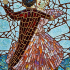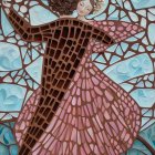 Prompt: Create a black and white image of an ethereal figure resembling a woman, elegantly posed against a dynamic abstract background filled with swirling patterns. She holds an ornate fan. Her long, curly hair cascades down her back, catching the light and adding to the enchanting atmosphere. The figure's attire is a flowing gown adorned with intricate floral details.