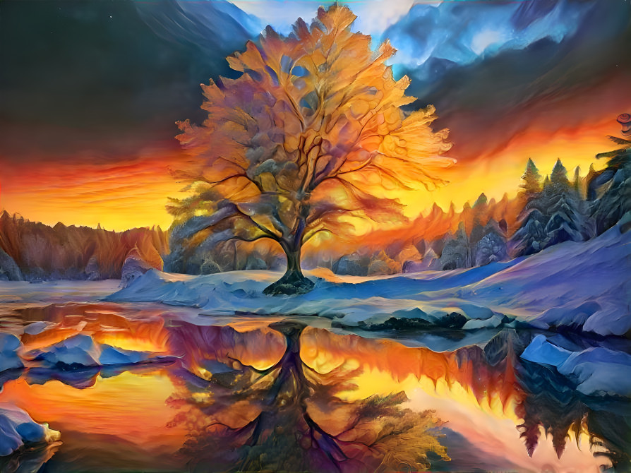 Prompt: Slowly moving river forming from sunlight shining through a hole in a cloudy sky, the river flows into a lake with a pair of relaxing kayakers, the lake is surrounded by an autumn forest with changing leaves on all the trees.