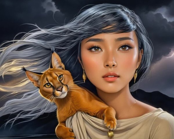 Prompt: Beautiful woman dressed in a simple tunic with a golden jewelry collar, jet black hair flowing in wind with a storm in background, a pet caracal perched on left shoulder, backlit by lightening, amazing detail