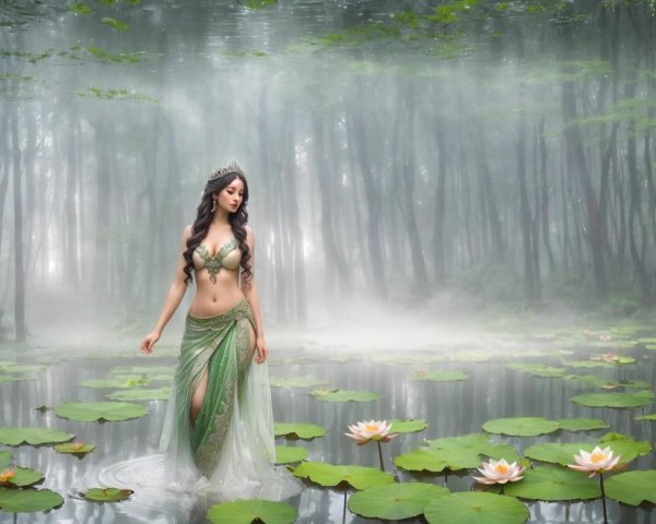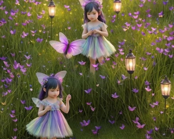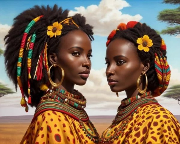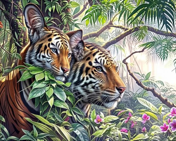 Prompt: in a fantasy landscape of tiny flowers in a field along a turquoise blue river sits two regal cats in the style of the Egyptian god Bast. Cherry trees in spring bloom cover the slope gently rising to the right. Intricately detailed.