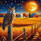 Prompt: Create an image featuring three Indigenous women standing side by side, each draped in uniquely designed traditional garments that are rich in color and detail. The woman on the left wears a striking red cloak adorned with intricate patterns and symbols. The middle figure is dressed in a white cloak, also embellished with symbolic designs, and the woman on the right wears a blue cloak decorated with geometric shapes and accents. Each woman has long, dark hair styled with traditional elements, including feathers that signify their cultural significance, positioned prominently in their hair. The background should depict a vibrant night sky filled with stars, a large crescent moon, and a variety of celestial elements like clouds and smaller moons, creating a mystical atmosphere. The foreground features soft grass and hints of wheat, adding a natural touch to the scene. The overall mood is one of unity, tradition, and reverence for culture.