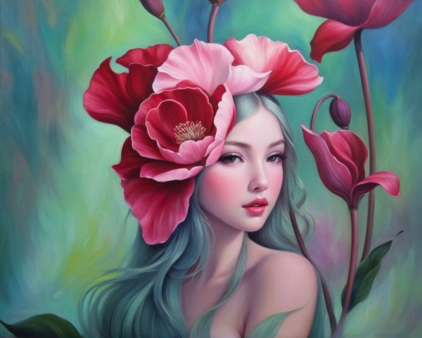 Prompt: A dreamlike double-exposure artwork of a serene woman silhouetted against a radiant sunrise. Her flowing form blends seamlessly with trees, rippling water, and glowing skies of pink, orange, and gold. Birds and butterflies drift around her, creating a balance of calm and cosmic wonder. The composition radiates tranquility and renewal, fusing human beauty with the poetry of nature.