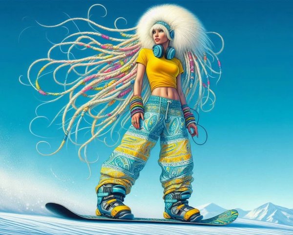 Prompt: Create an image of a young woman standing against a surreal landscape. She has a fair skin tone and an elegant, elongated facial structure with soft features. Her long hair is dark brown, flowing loosely in the wind, adding a sense of movement. The woman wears a distinctive garment composed of geometric shapes in green, orange, and brown tones, mimicking a patchwork design.