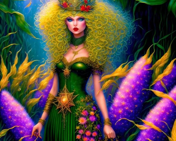 Prompt: A person sitting at a waterfall. In a djungle. Sun is shining on her. She is absorbing all the elements of nature, energizing and illuminating her whole being with the energy of all the 5 elements. The atmosphere is mystical. Green, blue and golden colors. Painting style. Her naked body is vibrating and illuminating. Representing the elevation of consciousness and the deep connection of nature with her own body and full being.