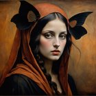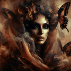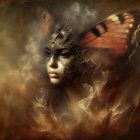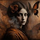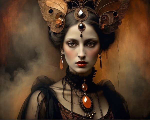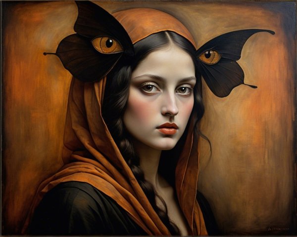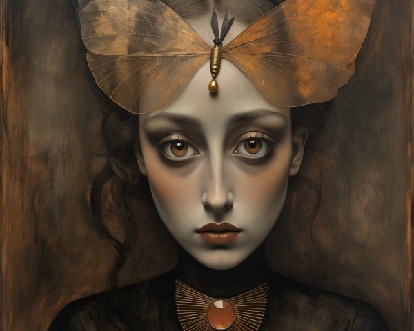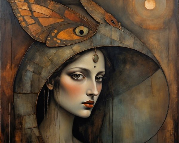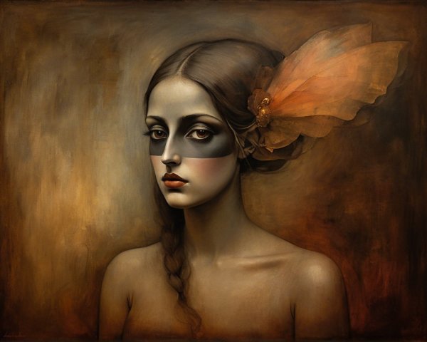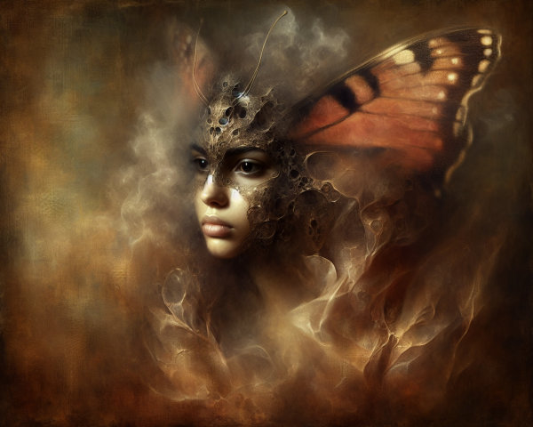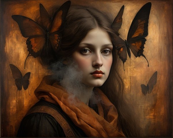 Prompt: Emerging chrysalis. foggy nostalgia, portrait in Burnt umber and salmon gold, smoke and mirrors, patina of, battery acid, art brut, moody, somber, desaturated colors, in the style of Paul Klee, Arthur Rackham Dark and moody oil painting of a woman with piercing black eyes, inspired by the works of John Singer Sargent and Edgar Degas, long shot, realistic texture, dramatic lighting, intricate details on clothing and Magical woman fading tones of melancholy and summer nostalgia, soulful portrait, in burnt umber, plutonium, patina of mercury glass, tea stains, art brut, moody, somber, desaturated colors, in the style of Paul Klee, Banksy, Arthur Rackham, based on Prompt by KRW