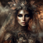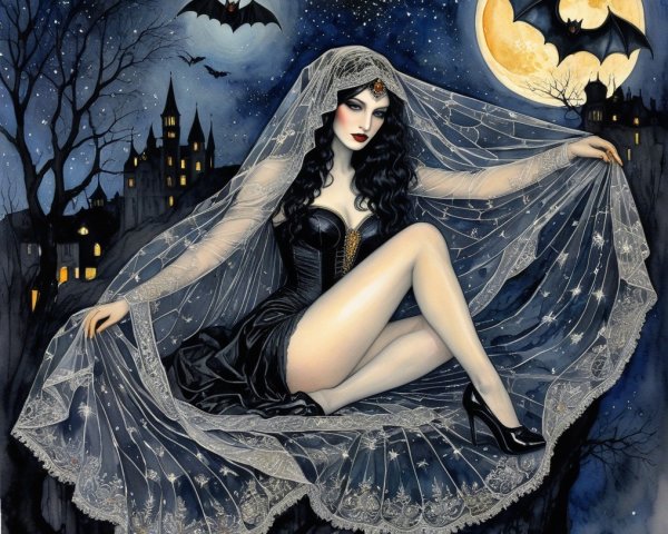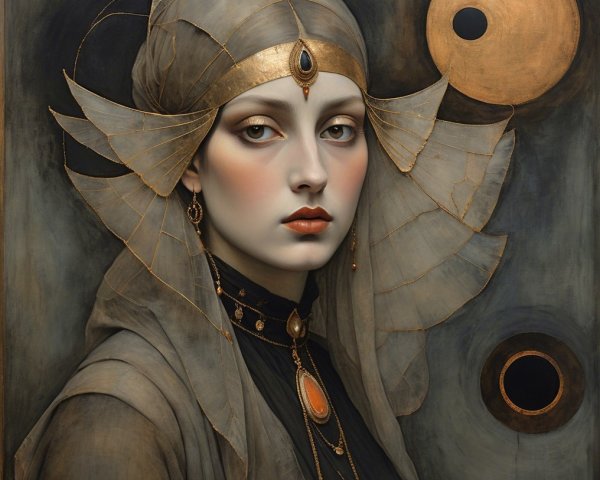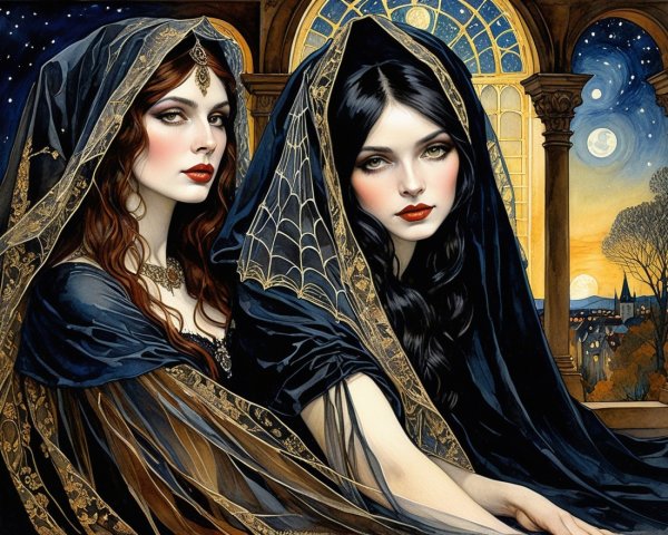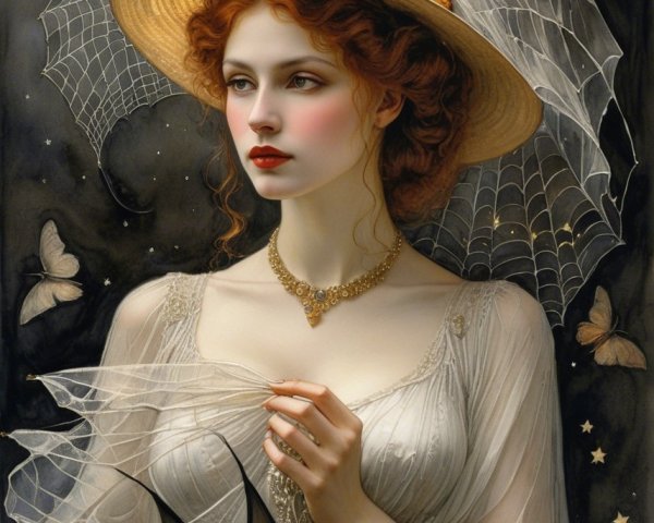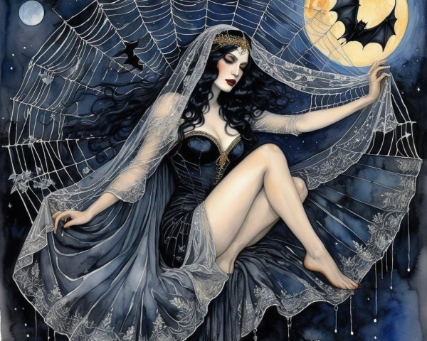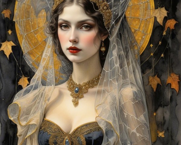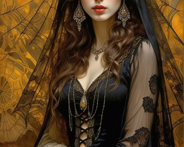 Prompt: Dark gothic gypsy of the night, spider web veil, in the style of Wolfe Von Lenkiewicz ,style klimt e Van Gogh