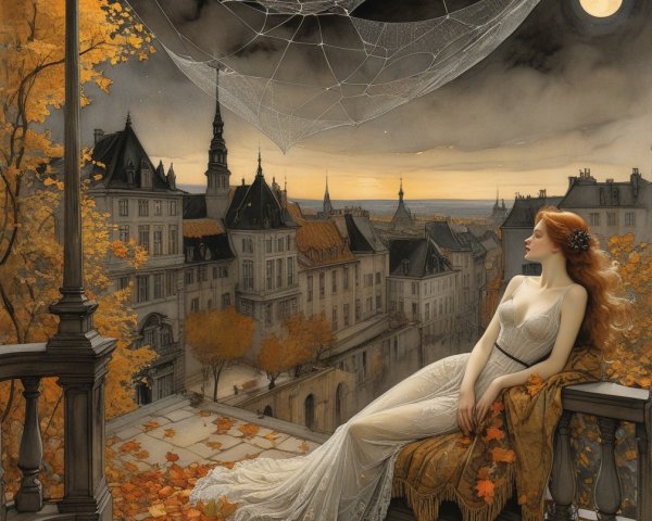 Prompt: FIRST AUTUMN lights in the old interior, spider web veil, in the style of Wolfe Von Lenkiewicz ,style klimt e Van Gogh