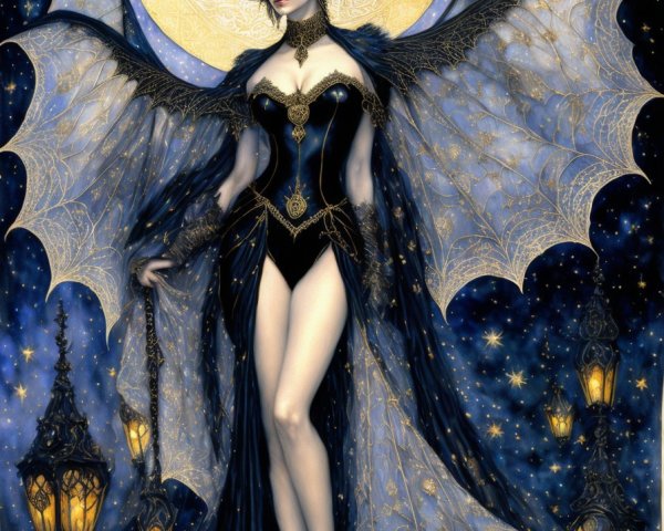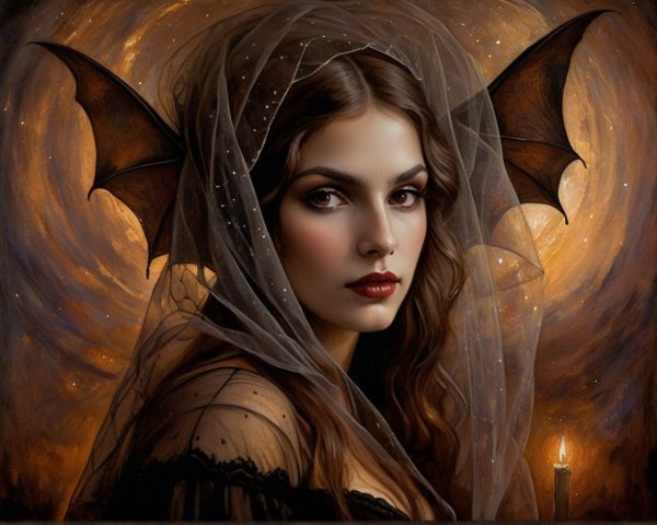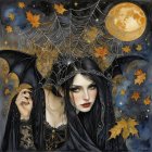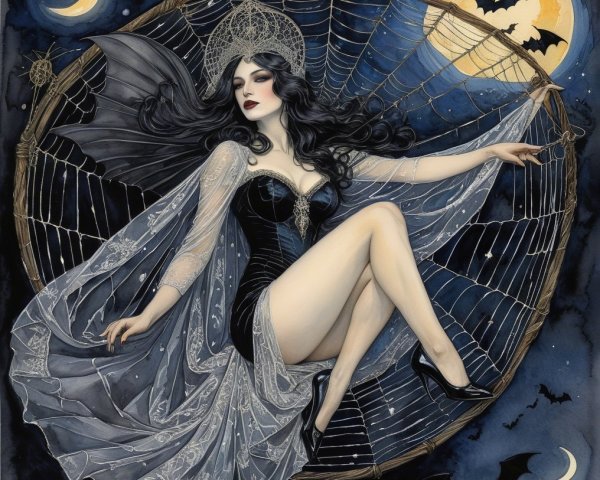 Prompt: “angel of night, of history and death and of light”. Dark gothic gypsy sorcerer bat woman of the night, spider web veil, in the style of Wolfe Von Lenkiewicz ,style klimt e Van Gogh