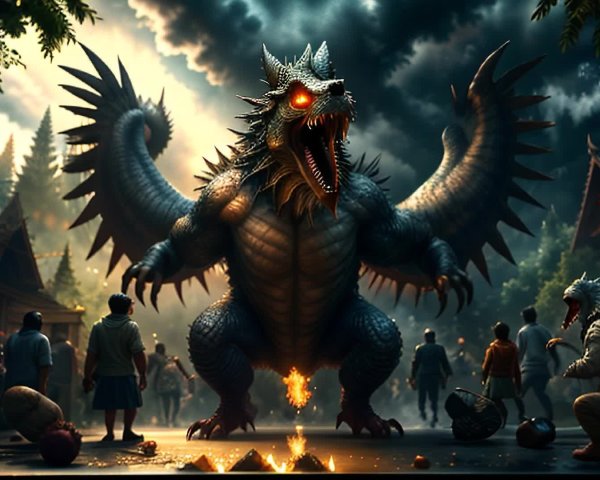 Prompt: A colossal, mutated turkey towers over a traditional Thanksgiving gathering, its feathers ragged and iridescent with unnatural colors sickly greens, burning reds, and metallic bronze. Its eyes glow an eerie yellow, and its beak is jagged and oversized, dripping saliva as it lets out a monstrous screech. Its wings are massive and tattered, with extra bone-like spurs jutting out, and its legs are thick and powerful like a prehistoric beast. Below it, a suburban backyard Thanksgiving feast has erupted into chaos. A long table covered in autumn decorations, pies, and plates is overturned, food flying everywhere. Terrified families scatter in different directions, chairs falling over, napkins spiraling through the air. A roasting pan glints on the ground as the mutant bird stomps forward, cracking the pavement beneath its talons. Behind the creature, stormy gray clouds gather, lit by flashes of lightning that silhouette its enormous form. Leaves whip through the air, and the warm glow of string lights around the patio flicker wildly. The scene is equal parts absurd, terrifying, and darkly humorous a Thanksgiving celebration turned into a creature-feature disaster movie.