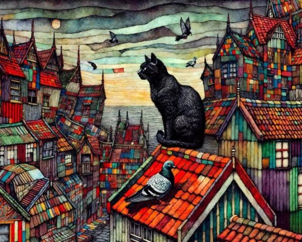 • Prompt: Black cat silhouette filled with neon rain reflections