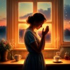EmmAI dreamy hazy breezy rainy-night portrait of a fragile young woman with wet hair, translucent white fabric on bare shoulders. Raindrops on glass blur amber lantern glow behind her. Palette of misty sapphire, storm blue, and soft golden bleed. Watercolor-oil hybrid, intimate poetic framing. No text. No artifacts.