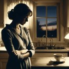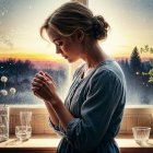 Prompt: A woman with a messy bun, black turtleneck, tulle skirt, sitting on a viewpoint over a twinkling city at dusk. Face and eyes in Pointillist dots, hair and skirt painted with loose Impressionist brushstrokes and watercolor washes, city lights accented with Fauvist vibrant dots, ink details on windows and skyline edges. Blue-grey textured background with layered mixed-media textures, sepia canvas, soft warm light highlighting her profile