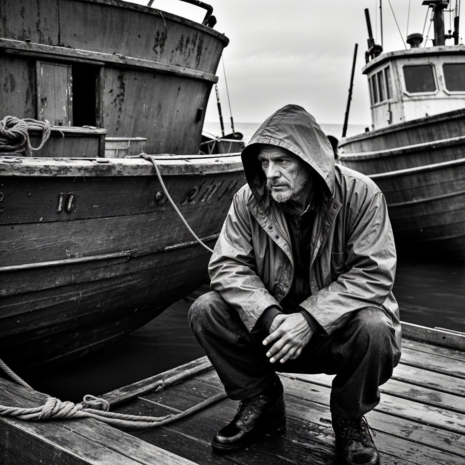 Prompt: A weathered fisherman leaning against the wall of an old fishing boat, wearing a hooded raincoat, holding a cigarette in his hand. The deck is wet and rough, another fisherman stands in the background. The atmosphere is melancholic and gritty, evoking the harsh life at sea. Drawn with expressive, irregular ink lines in black and white, with subtle touches of deep blue to emphasize the cold and the mood. The style should feel raw, hand-drawn, almost sketch-like, with visible textures and emotional depth.