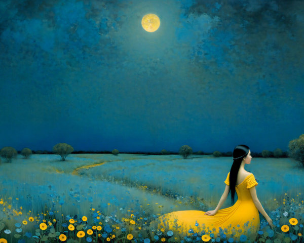 Prompt: The image depicts a vibrant scene: a full, golden moon dominates a red-blue sky, casting its light over a clear wide river. Along one of the riverbanks, a densely populated, illuminated golden village is visible.The opposite riverbank features glistening, damp rocks, with moonlight reflecting off their surfaces.A few birds rest on rocks and a blurred man silhouette on one too.