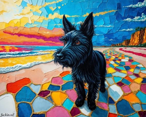 Prompt: A woman and her Gordon Setter walk along a forest path through the Landes de Gascogne. Front view, full-body shot. She walks along a sandy path bordered by thick thickets of flowering broom (yellow) and soft green ferns, whose delicate fronds reflect the dim light. Towering moorland pines frame the composition, their tall trunks and sparse canopies of pine cones casting long shadows across the moor. The muted palette of sand and soft greens, bright yellow, and forest browns evokes the calm and warm atmosphere of the Gironde moorland.