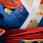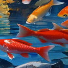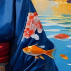 Prompt: Create a semi-abstract Impressionism painting, a dark haired Japanese woman in a red accented kimono submerged in a deep blue pool surrounded by assorted and colorful fish. Her eyes are nearly closed as if she is experiencing a mystical dream. The image features layered textures and fragmented elements using purposeful brushwork to make the Japanese girl emerge gracefully from the tranquil background pattern Half body, stylish dress.