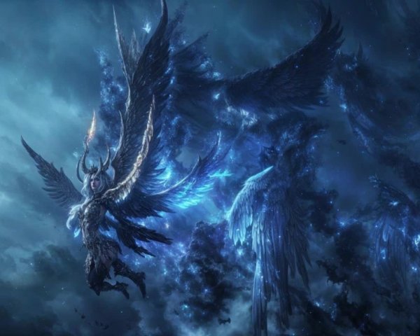 Prompt: Fiery demon with black wings, surrounded by ethereal angels with glowing halos, contrasting dark and light entities, dramatic and dynamic composition, intricate details on demon's horns and wings, soft and radiant light for angels, celestial background with stars and clouds, digital painting, fantasy theme, vibrant colors of red, white, gold, and black, high-resolution for intricate details, inspired by classical mythology, ArtStation showcase.