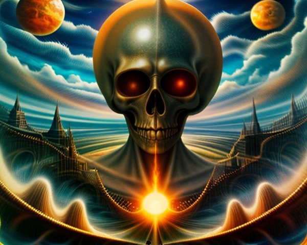 Prompt: The face of the enlightened Being who arrives through the Portal to higher dimensions of being beyond time in cymatic fractal design formed by solfeggio frequencies as eloquent architecture in the return to a harmonious Universe where the river of time meets the rocky shores of Space in a stunning colorful orbital Cathedral, the meeting place of ascended beings, in the style of Rembrandt.